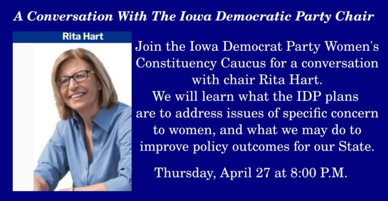A Conversation With Rita Hart On April 27, 2023, we learned what the IDP plans are to address issues of specific concern to women, and what we may do to improve policy outcomes for our State.CLICK HERE to view the Zoom session. Page Views: 33